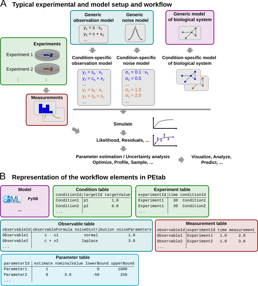 Measurements are linked to the biological model by an observation and noise model. Often, measurements are taken after some experimental perturbations have been applied, which are represented as derivations from a generic model (Figure 1A). Therefore, one goal was to specify such a setup in the least redundant way. Furthermore, we wanted to establish an intuitive, modular, machine- and human-readable and -writable format that makes use of existing standards.