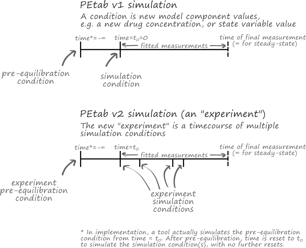 simulationConditionIdandpreequilibrationConditionIdin the Measurement table are replaced byexperimentIdand a more flexible way for defining experiments and time courses. This allows arbitrary sequences of conditions and combinations of conditions to be applied to the model (Figure 3 and Experiment table).